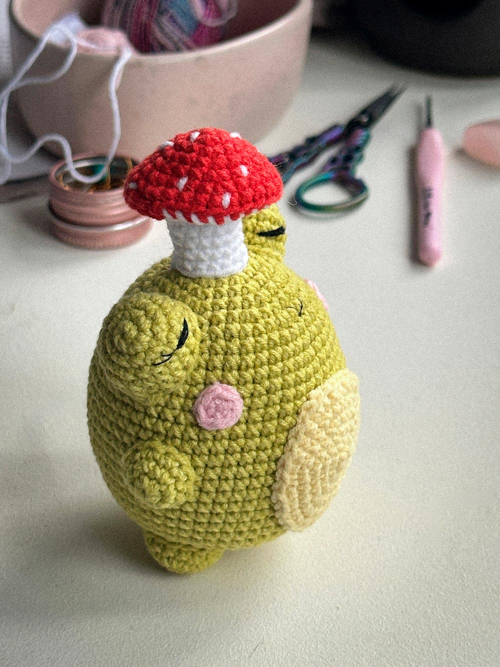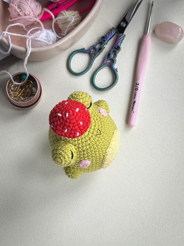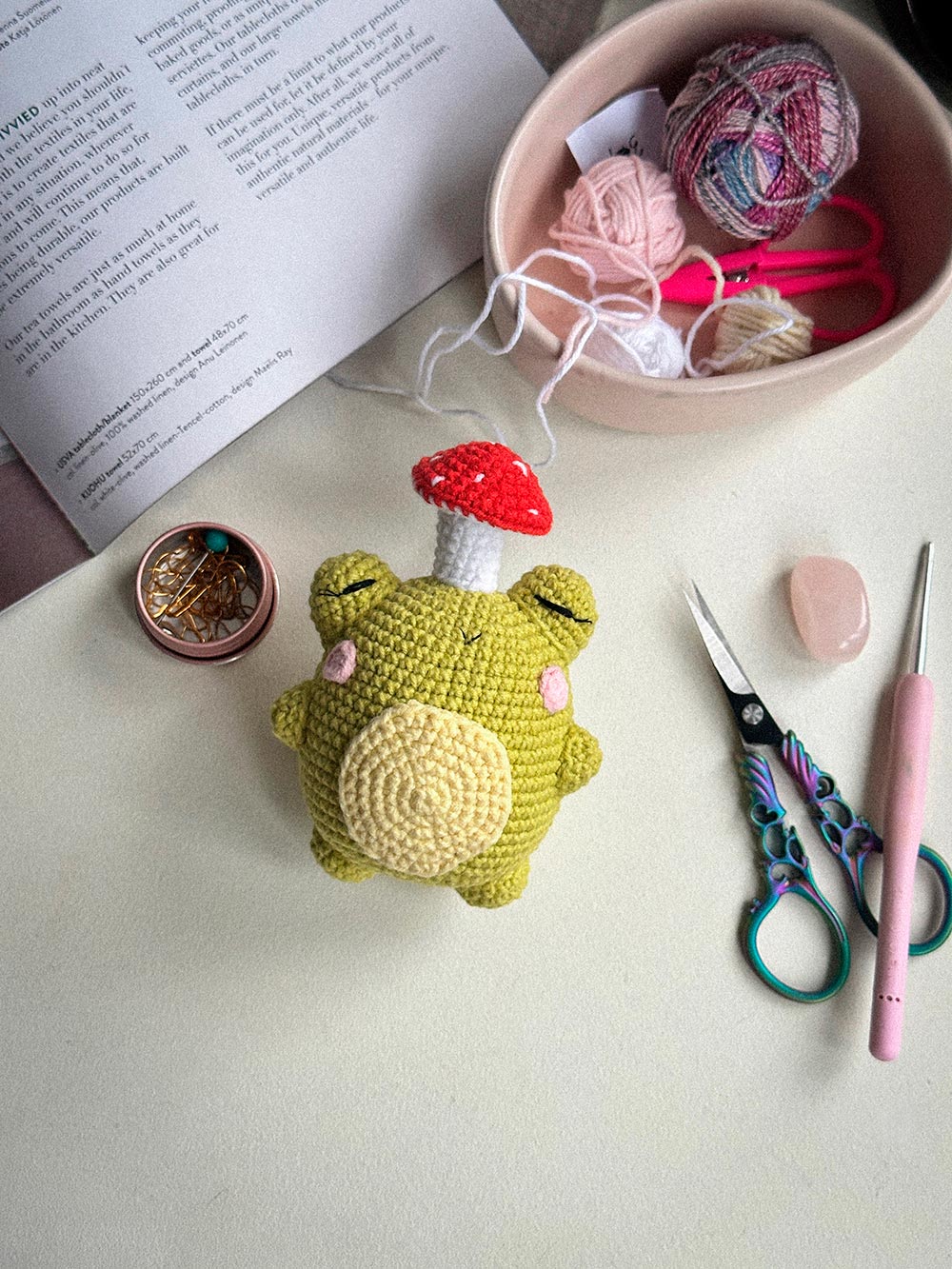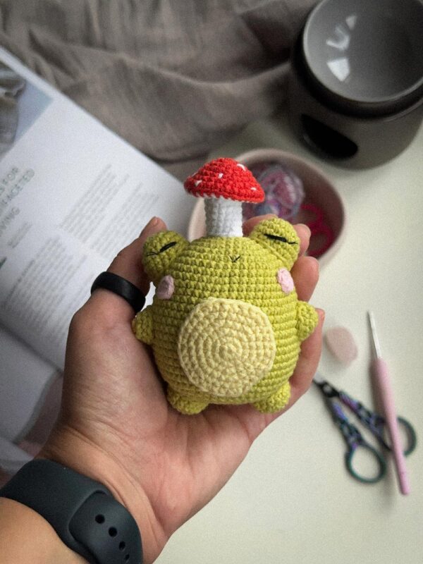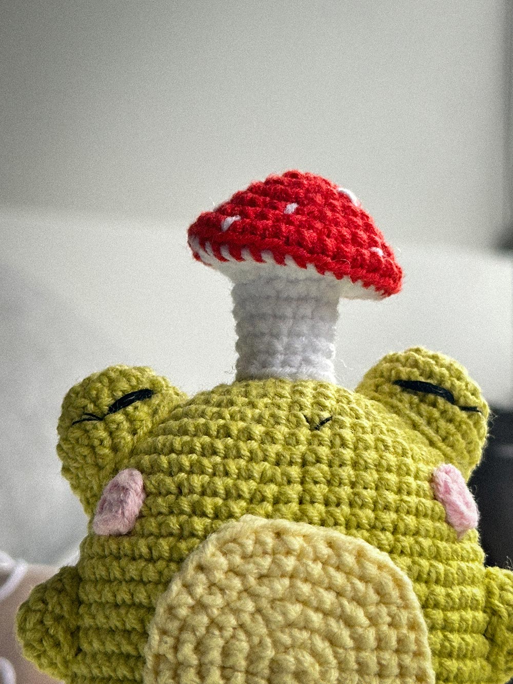 Froggy with a Mushroom Hat is a handmade crochet amigurumi character, carefully created with attention to shape, texture, and soft, rounded proportions.