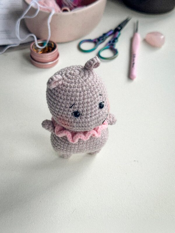 Pippa the Happy Hippo is a handmade crochet amigurumi character, carefully crafted with attention to shape, texture, and soft, rounded details.
